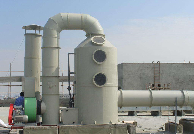 本凈化塔由圓形塔體,用法蘭分段聯(lián)接而成。具體結(jié)構(gòu)由貯液箱、進(jìn)風(fēng)段、兩級(jí)噴淋段、旋流板、出風(fēng)錐帽等組成。該塔特點(diǎn)是:強(qiáng)度高,結(jié)構(gòu)簡(jiǎn)單,制作方便,占地面積小,拆裝、搬運(yùn)方便,凈化效率高。噴淋形式采用雙層填料,兩級(jí)噴淋,使氣液充分接觸,提高凈化效率。本塔配用一臺(tái)玻璃鋼離心通風(fēng)機(jī)和塑料水泵或不銹鋼水泵即可。當(dāng)處理風(fēng)量在10000立方米以上時(shí),采用二臺(tái)水泵就能達(dá)到設(shè)計(jì)要求。