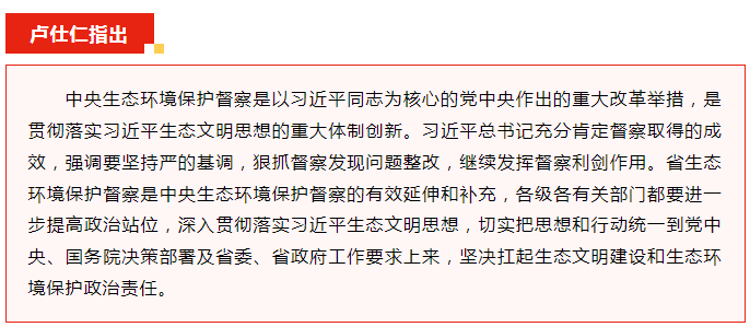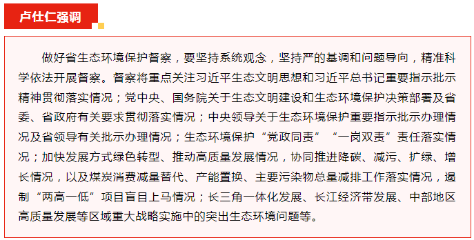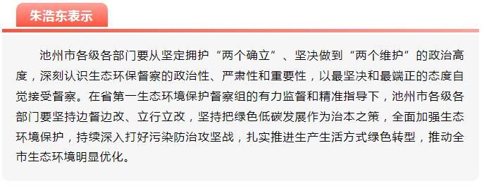 為深入貫徹習(xí)近平生態(tài)文明思想,認(rèn)真落實(shí)黨中央、國務(wù)院關(guān)于生態(tài)文明建設(shè)和生態(tài)環(huán)境保護(hù)的決策部署,全面貫徹全國、全省生態(tài)環(huán)境保護(hù)大會精神,經(jīng)省委、省政府批準(zhǔn),省第一生態(tài)環(huán)境保護(hù)督察組對池州市開展生態(tài)環(huán)境保護(hù)督察。5月30日,督察進(jìn)駐動員會在池州市召開,督察組組長盧仕仁、副組長顧群分別就做好督察工作作了講話,市委書記朱浩東進(jìn)行了進(jìn)駐動員,市委副書記、市長賀東主持會議。